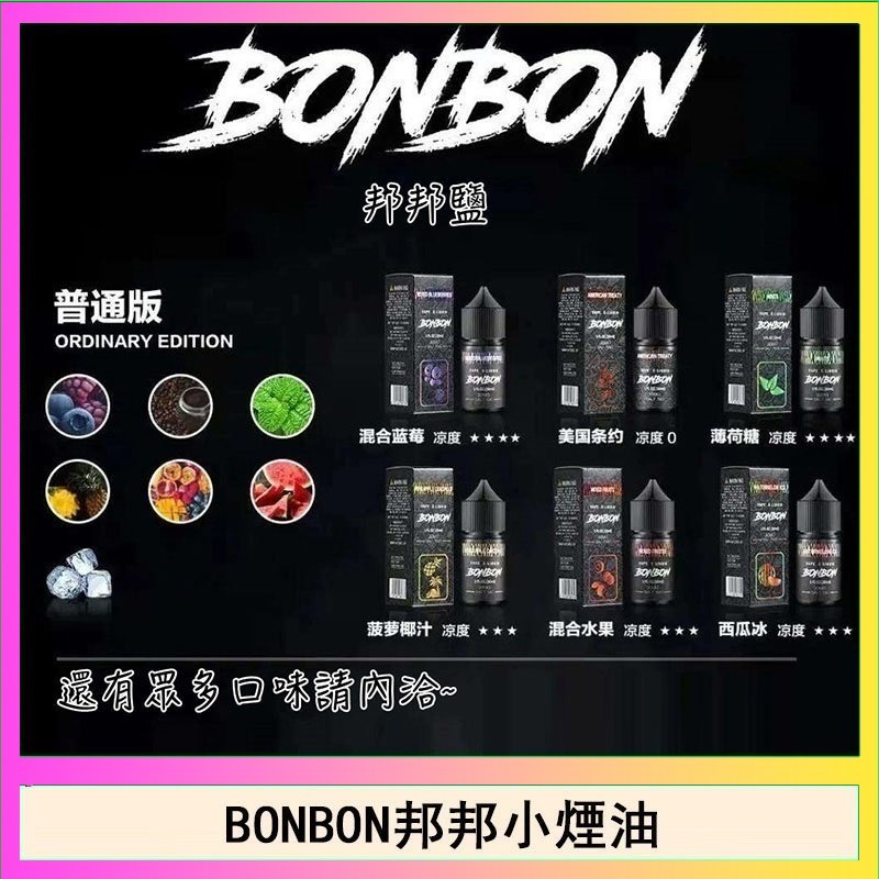 口味: 西柚 红冰 山楂 混合水果 惡魔之吻 薄荷糖 菠萝椰汁 西瓜冰 莓果廚師 混合蓝莓 法式檸檬派 今夜無飲 小芒芒 七星菸草薄荷 黑牌煙草 王牌煙草 曲奇煙草 黑標五木煙草 小綠人